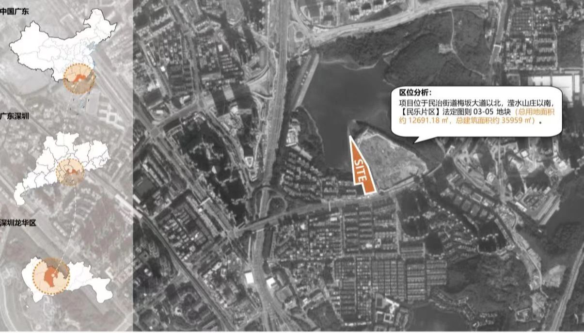 項目位于龍華區民治街道梅坂大道以北,瀅水山莊以南。南側、西側和東側為二類居住用地,北側為水庫水面。學??傆玫孛娣e12691.18平方米,總建筑面積約35959平方米,擬建設一所36班/1620學位小學。